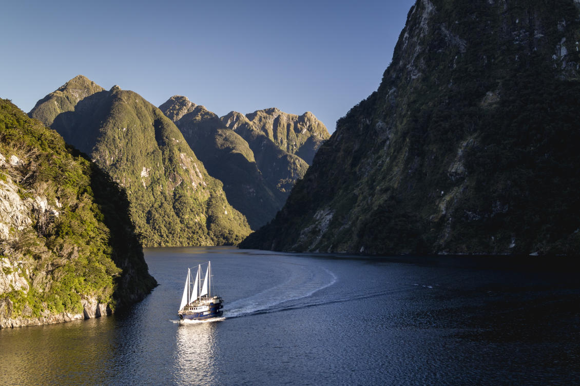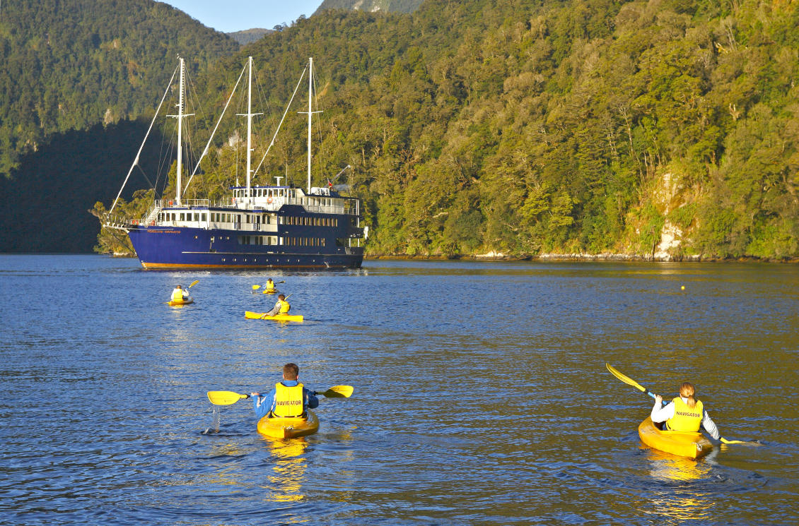 Experience the unspoiled and remote wilderness of Doubtful Sound by staying overnight on board the Fiordland Navigator World Heritage-listed Doubtful Sound is an overwhelming environment. Three times longer than Milford Sound, with a surface area ten times larger, it is a place of towering peaks and bush-clad islands; of twisting, hidden arms and sheltered coves. As it is renowned for its fantastic marine life, you are likely to see seals and dolphins during this cruise. The cruise offers private cabins, spacious viewing decks, a comfortable dining saloon for dinner and breakfast and the opportunity to kayak or explore in a tender boat with an expert nature guide. It is truly a special experience.